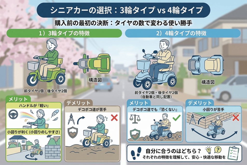 シニアカーの購入を検討するときに最初に分かれる選択肢は、3輪タイプにするか、4輪タイプにするかです。