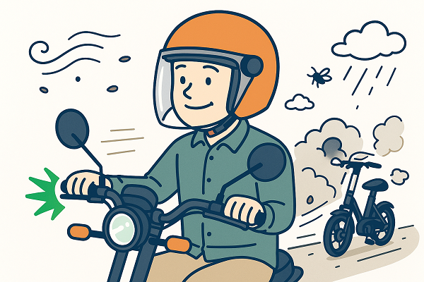 自転車、特定小型は基本的にオープンな乗り物であるため、走行中に砂ぼこりや小石、虫、雨風が直接顔に当たるリスクがあります。