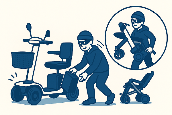特定小型四輪はコンパクトかつ軽量な構造のため、場合によってはわずか数分で持ち去られるリスクがあり、他には本体は無事でもバッテリーが抜き取られるなどの被害が発生しています。