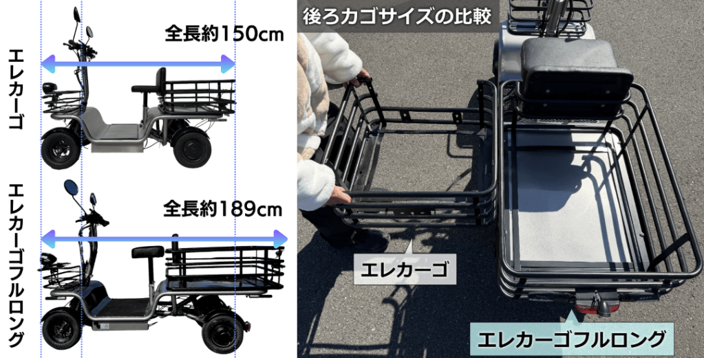 全長約 189cm×横幅約59cm と、特定小型四輪の制限寸法の範囲で、ほぼ最大級のサイズに設計されており、抜群の積載量と使い勝手を実現。毎日の買い物、倉庫内移動、配達業務からレジャー利用まで、幅広い用途に対応します。