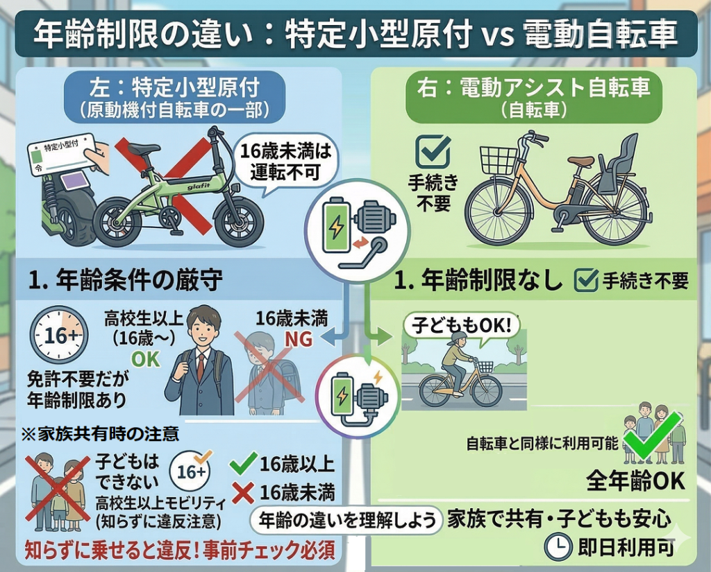 特定小型原付と電動自転車は、利用できる年齢にも違いがあります。
