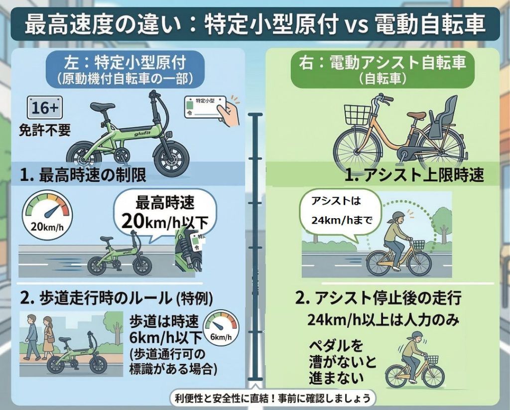 また、速度を一定に保つためには継続的にペダルを漕ぐ必要があることから、移動効率という点では特定小型原付に劣る場面もあります。