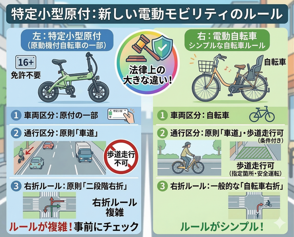 特定小型原付は、道路交通法上「原動機付自転車の一部」として扱われる“車両”です。 そのため、通行区分や右折時のルールなどがやや複雑になります。 |