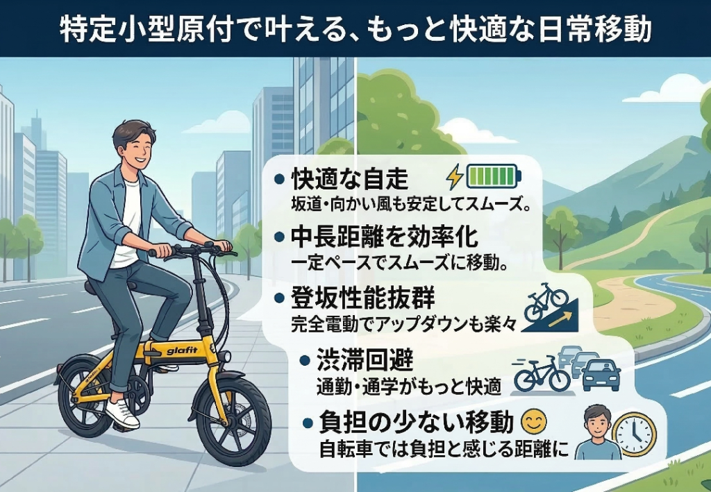 ペダルを漕ぐ必要がないので坂道や向かい風でもペースが落ちにくく、通勤や通学、その他日常移動の負担を大幅に軽減できます。