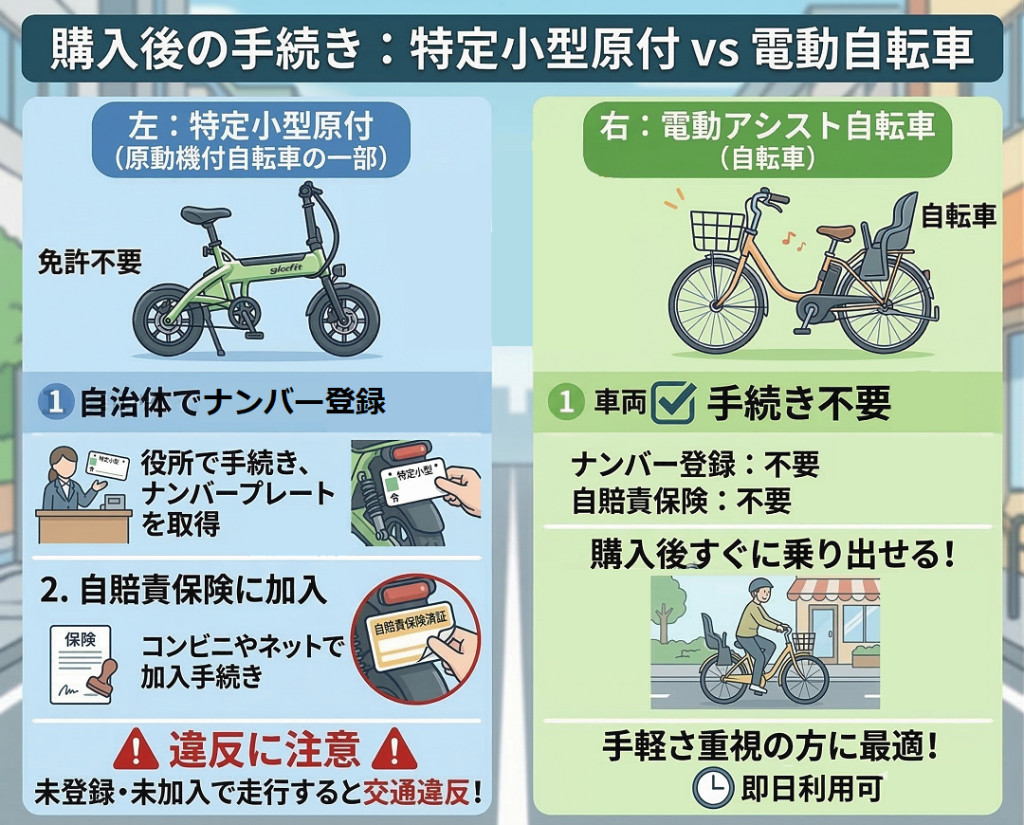 特定小型原付と電動自転車では、購入後に必要な手続きが異なります。