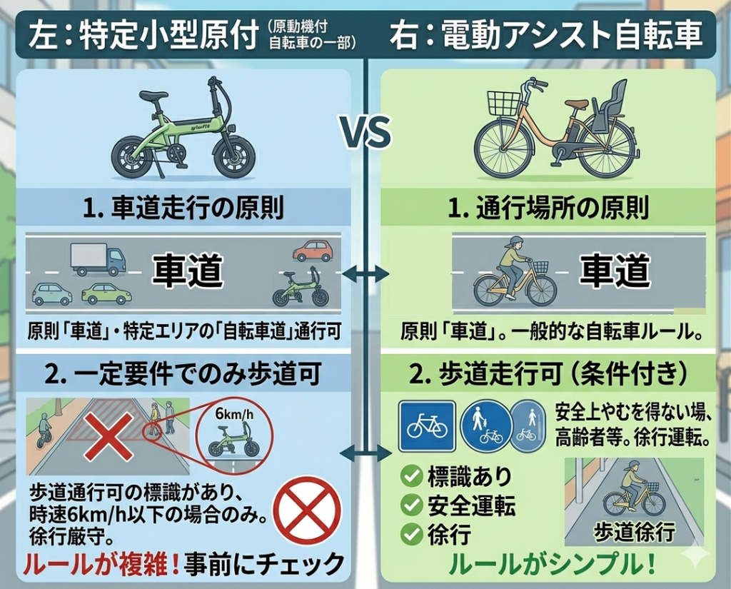 特定小型原付と電動自転車の違いにおいて、日常の使いやすさに直結するのが「どこを走れるか」です。