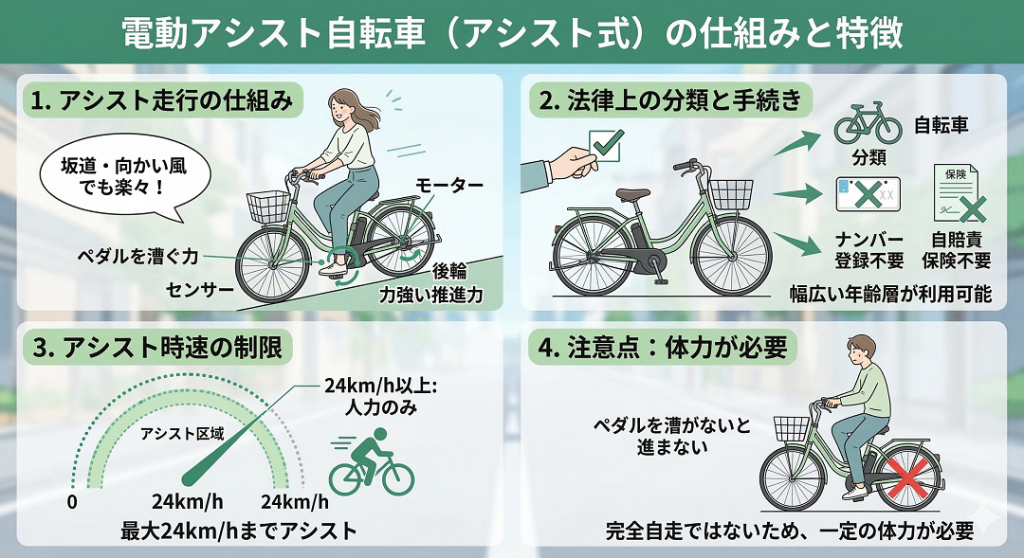 電動アシスト自転車(以下、電動自転車)は、ペダルを漕ぐ力をモーターが補助する「アシスト式」の自転車です。