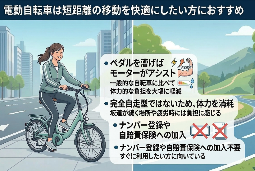 法律上「自転車」に分類されるため、ナンバー登録や自賠責保険への加入は不要となり、幅広い年齢層の方が利用できます。
