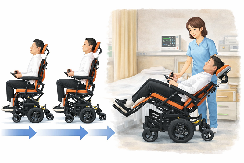 座位変換型の電動車椅子は、リクライニングやティルト機能などにより座る姿勢を細かく調整できるタイプです。