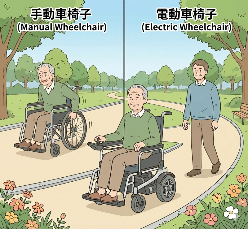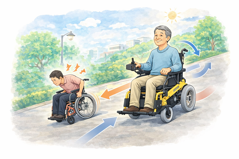 電動車椅子はモーターの力で走行するため、手動車椅子のように腕や肩の力を使って動かす必要がありません。