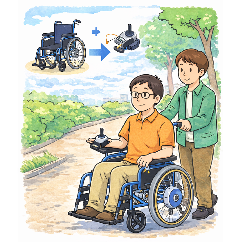 簡易型は手動の車椅子に電動ユニットを取り付けた電動車椅子です。