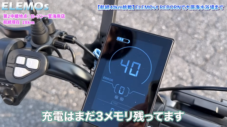 バッテリー残量は2メモリを保っているので、余裕を残してELEMOs4 REBORNのカタログ値(航続距離40km)を達成しました!