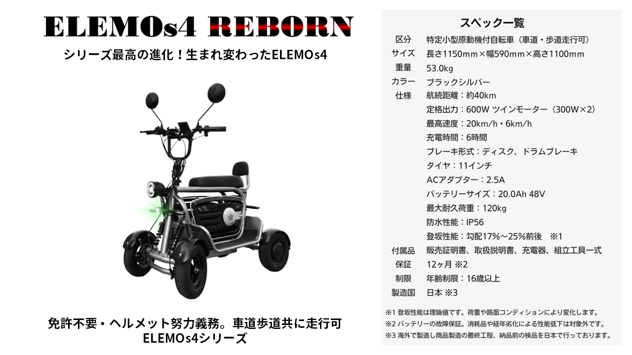 【性能等確認適合車】三代目 ELEMOs4 REBOEN(リボーン)|特定小型EV四輪