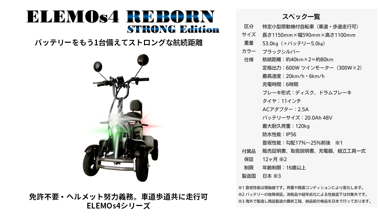 今回の大幅な進化により、最大の安心感を手に入れたELEMOs4シリーズ三代目のREBORN(リボーン)は、保安基準を満たしただけではない特別な1台です。