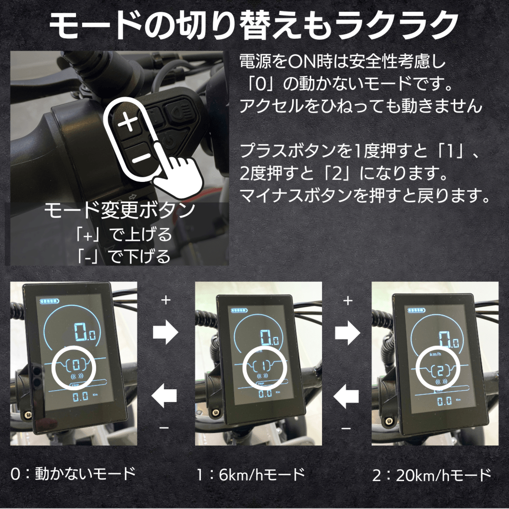 走行モードの切り替えも簡単。プラスボタンとマイナスボタンだけで操作します。