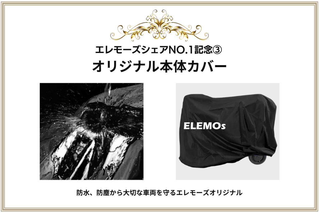 今回、特定小型、特例特定小型に必要な保安基準部品は全てついてきまして、運転のしやすくなるミラーや何度でも入る収納、走行がとてもラクになる背もたれも全てセット。さらにELEMOs4シリーズをご購入の方には、空気を入れるだけでなく、空気圧のチェックもできるメンテナンスに欠かせない電動空気入れ、電源ONOFF時に必須のスマートタッチキーのスペア、大切な車体を守るオリジナル本体カバー、23,000円相当のオプションを無料でお付けして、この価格です。