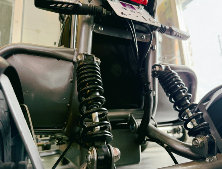 前輪、後輪に搭載した存在感溢れるサスペンションは、ぐらんぐらんと上下に弾まないよう少し硬めにセッティングしています。柔らかいサスペンションはカーブを曲がるときに左右に傾いたり、過剰な揺れや振動を招く原因にもなりますので、総じて挙動が不安定になります。